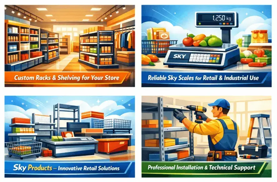 • التصنيع وتجهيز المحلات: تصميم وتنفيذ الهياكل المعدنية، الرفوف، وتجهيزات السوبرماركت والمستودعات بشكل متكامل.